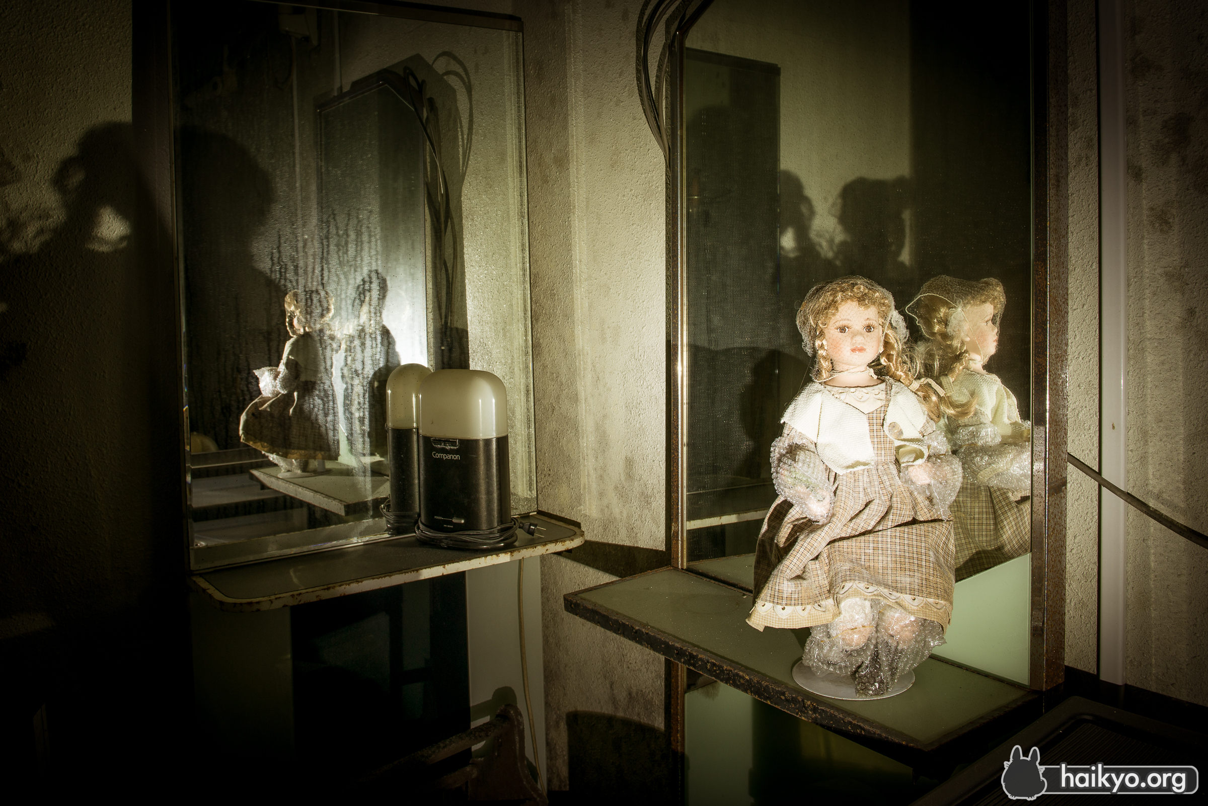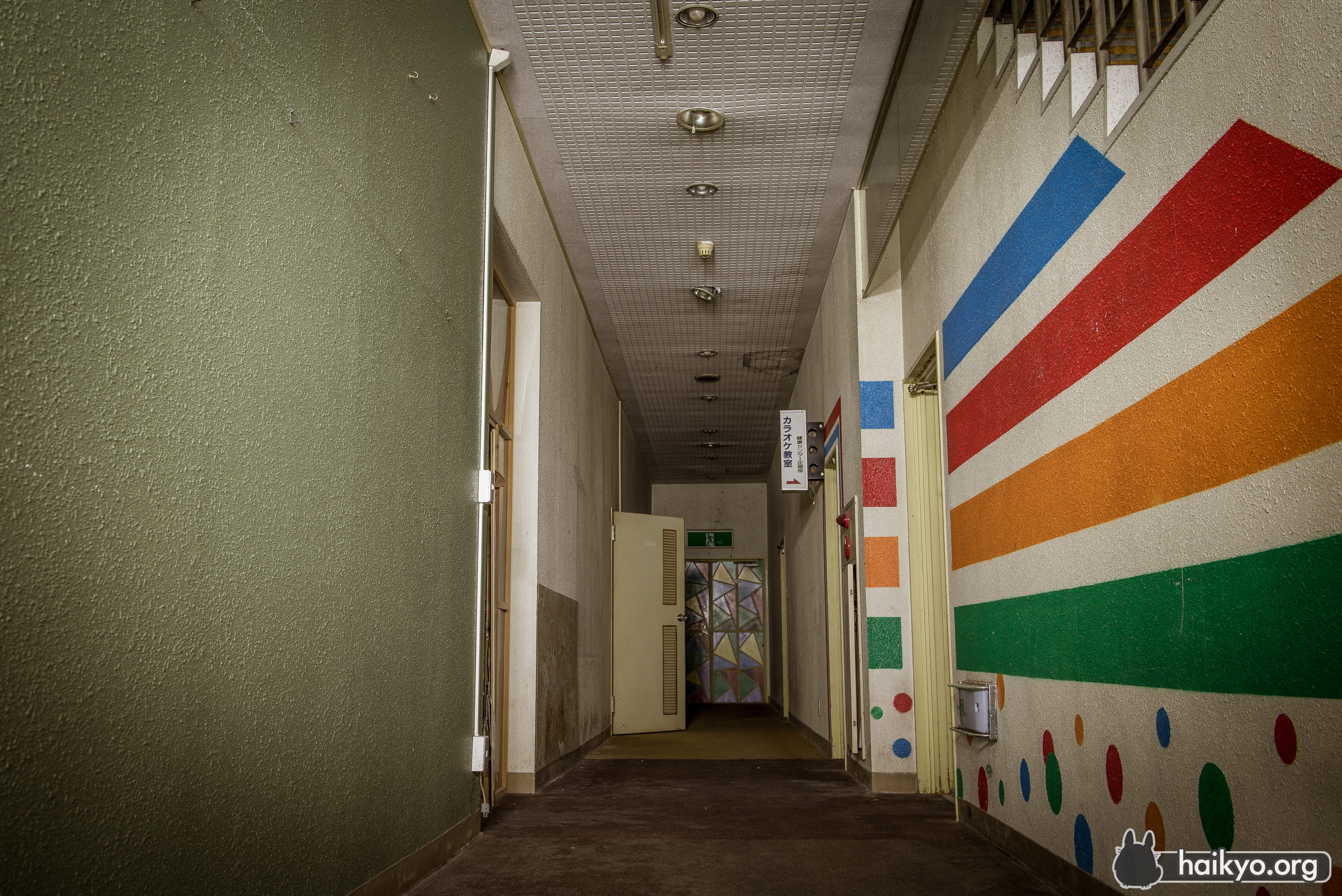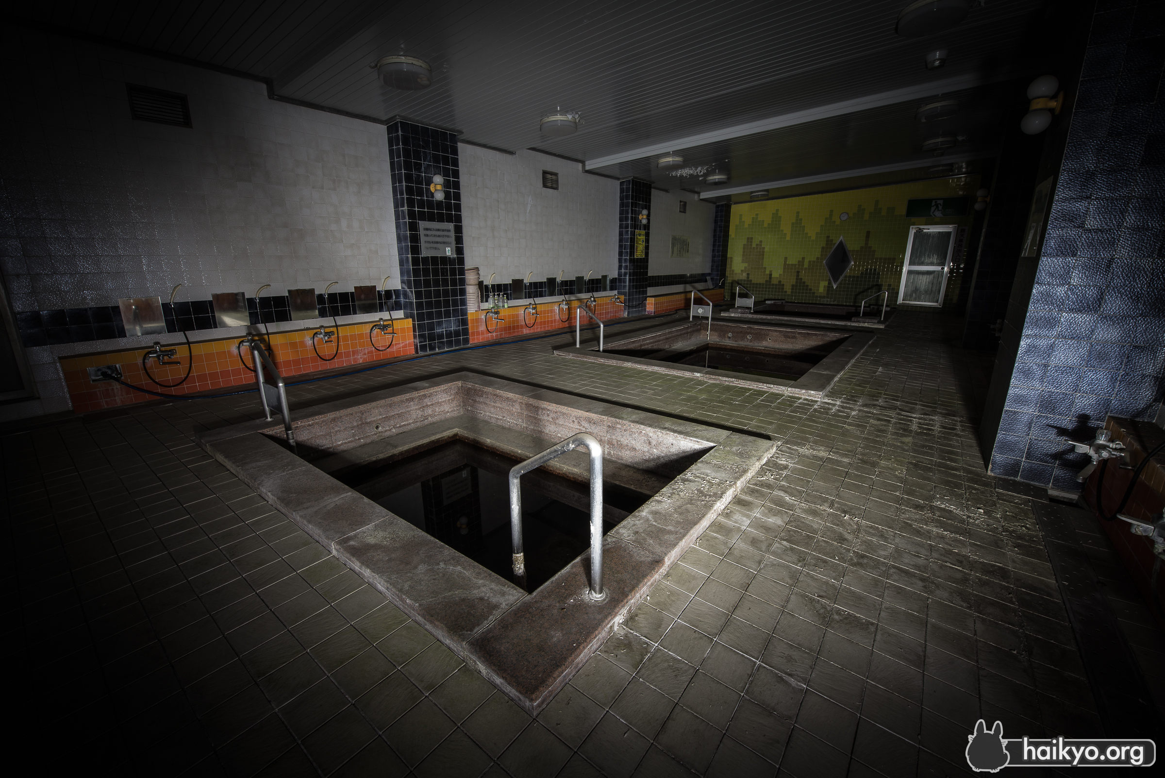 この健康センターが廃墟となったのは、それほど前のことではない。ここの情報を探すと、まだ使われていた頃の情報のほうが、廃墟になってからのものより多く出てくる。素敵な温泉浴場(屋内および屋外)、カラオケ、美容院等が完備され、地元の人々に人気だったに違いない。しかし、比較的最近廃墟になったにもかかわらず、ここはかなり陰湿で不潔な場所だ。湿気が非常に多いので、カビの悪臭が鼻をつき、ほこりやクモの巣でいっぱいで、長くはいたくない。しかし良い所は、人があまり訪れていないことで、落書きやゴミ等も一切無かった。ここを訪れたのは星の明るい夜だったので、予期せず面白い写真が撮れた。