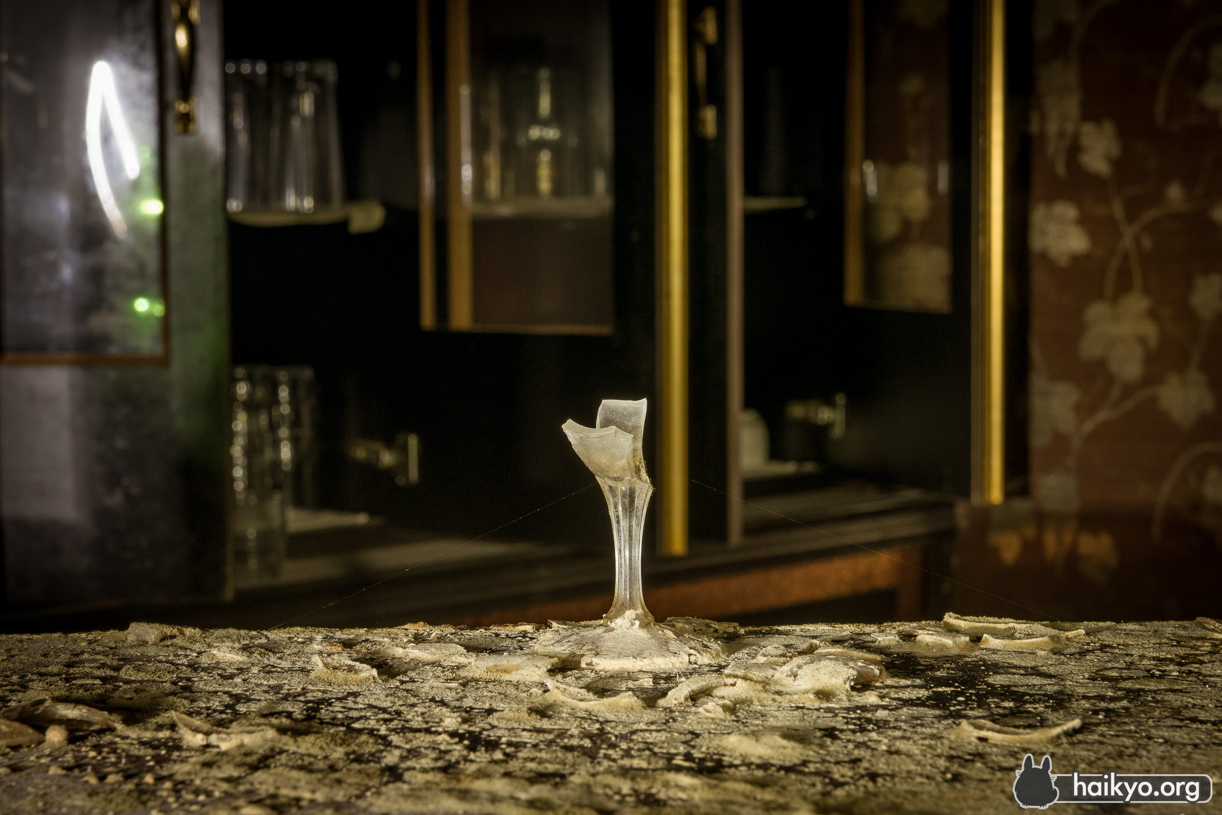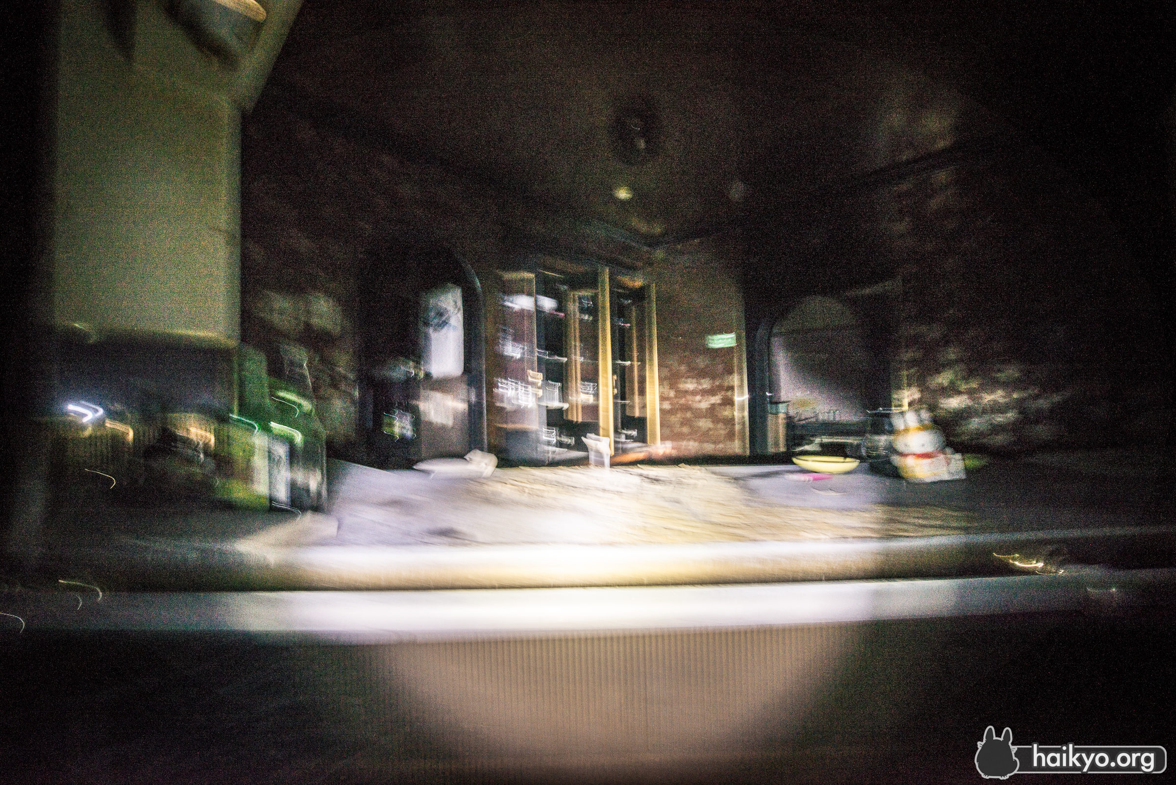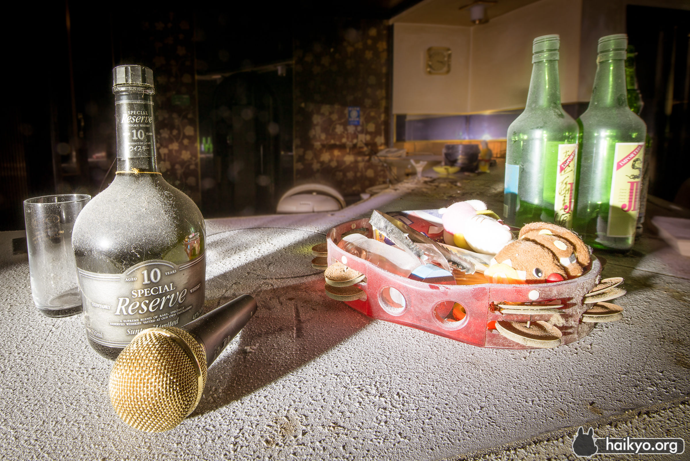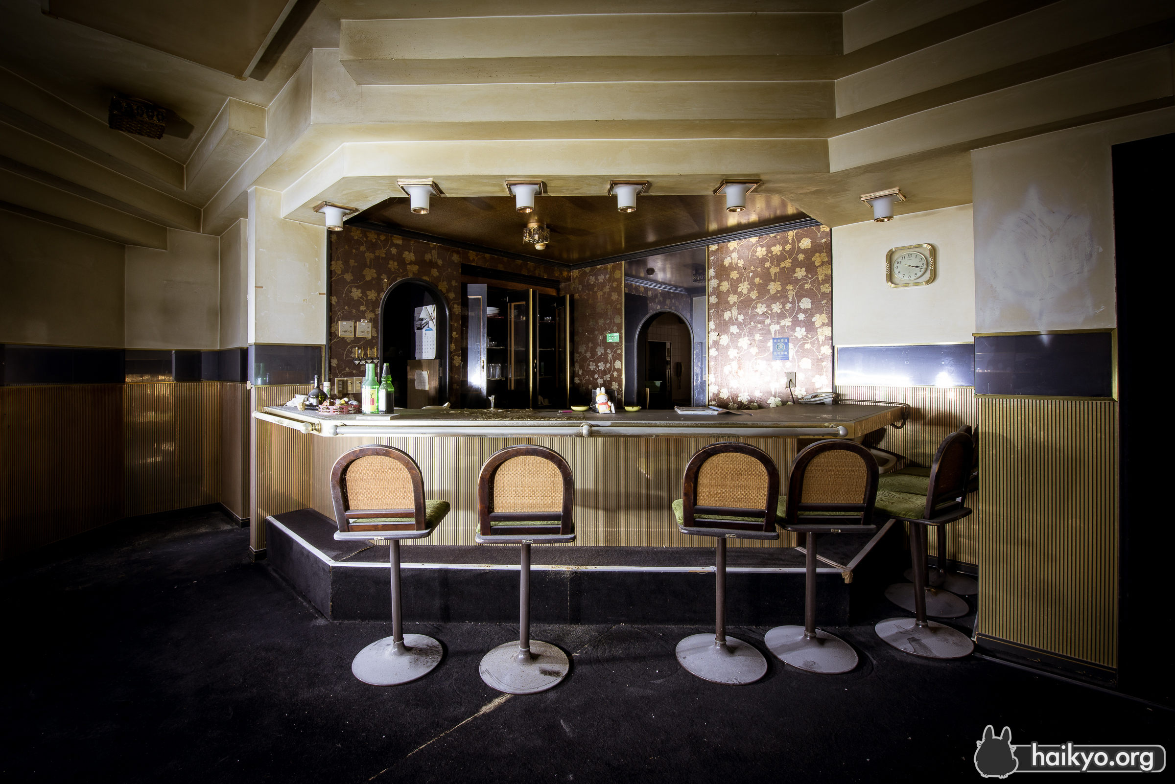 この健康センターが廃墟となったのは、それほど前のことではない。ここの情報を探すと、まだ使われていた頃の情報のほうが、廃墟になってからのものより多く出てくる。素敵な温泉浴場(屋内および屋外)、カラオケ、美容院等が完備され、地元の人々に人気だったに違いない。しかし、比較的最近廃墟になったにもかかわらず、ここはかなり陰湿で不潔な場所だ。湿気が非常に多いので、カビの悪臭が鼻をつき、ほこりやクモの巣でいっぱいで、長くはいたくない。しかし良い所は、人があまり訪れていないことで、落書きやゴミ等も一切無かった。ここを訪れたのは星の明るい夜だったので、予期せず面白い写真が撮れた。