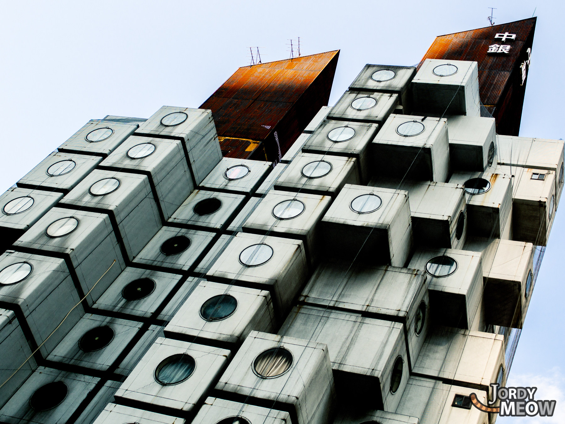 このタワーは元々東京外から来るサラリーマン達のセカンド・ハウスとしてデザインされたんだ。その特殊なユニット式のデザインは、部屋になっている各カプセルを自由に取り外し、交換できるようになっている。残念ながらタワーは計画されていたようには機能せず、現在の建築基準も満たしてはいないんだって。