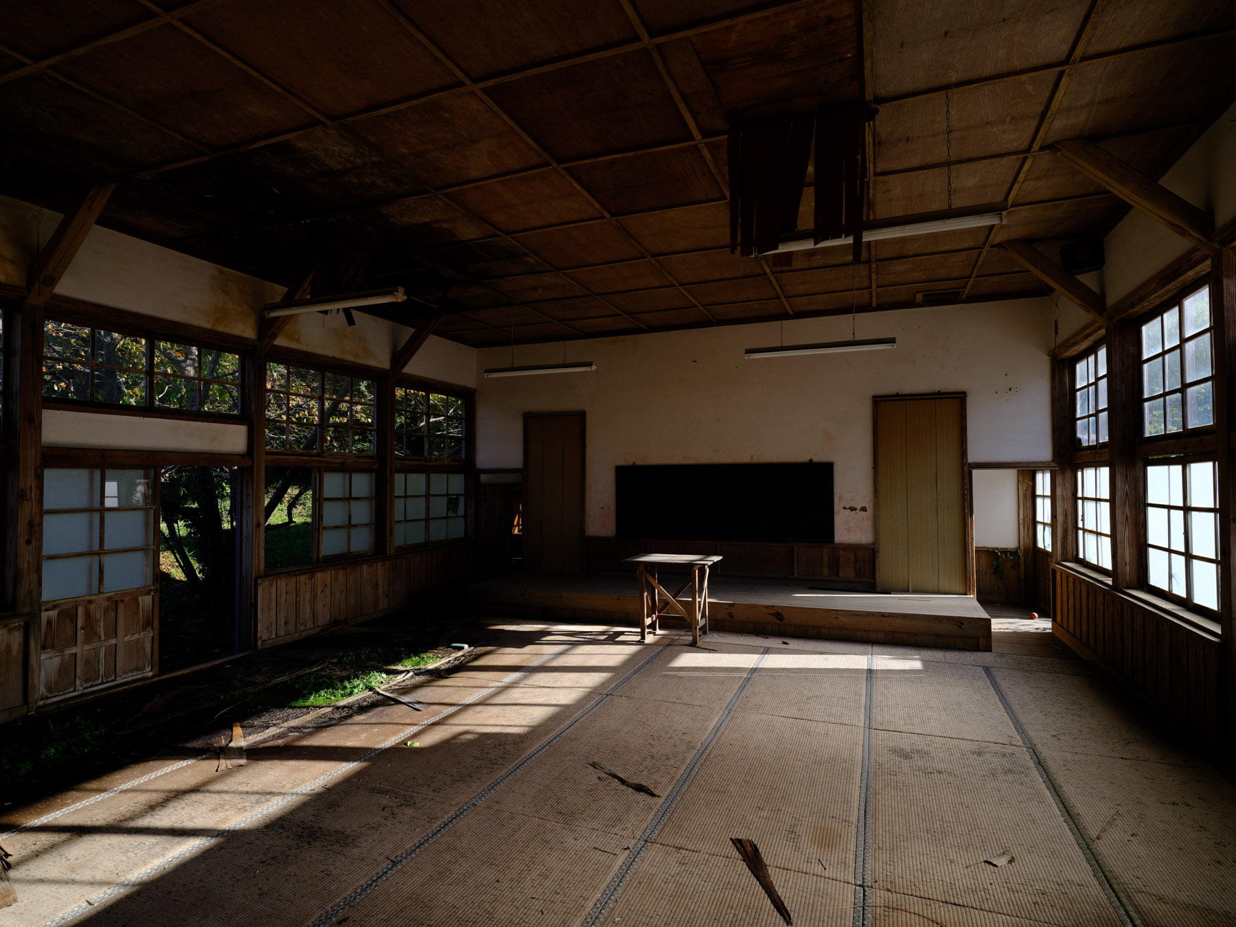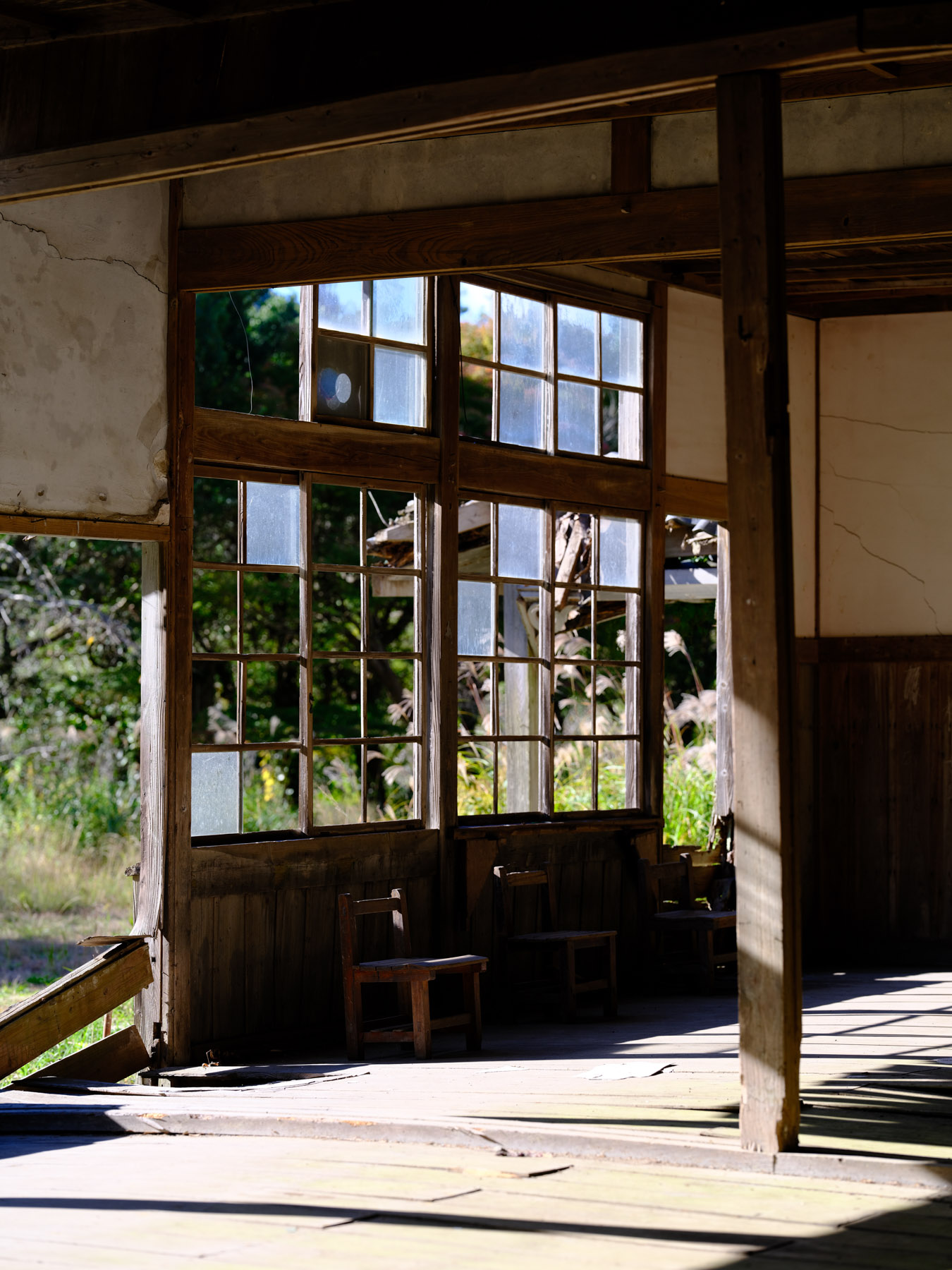 内部も魅力的で、剥がれた塗装や割れた窓ガラスが時の流れを感じさせます。廊下の壁には、かつてタオルや上履きを掛けていたフックが並び、一部の教室には黒板が残っています。しかし校舎の裏側は状態が悪く、壁から水が染み出し、沼のようになっています。長い間よく持ちこたえてきたものだと感心すると同時に、このまま朽ちていくのが惜しい場所です。老朽化していても、今なお訪れる者を魅了する不思議な雰囲気が漂っています。